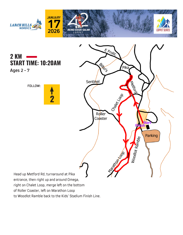 NEW COURSE FOR 2026! Young skiers are welcome to have a personal ski companion accompany them on the course. From the Main Start line head up Metford Rd, turnaround at Pika entrance, then right up and around Omega, right on Chalet Loop, merge left on the bottom of Roller Coaster, right up Marathon Loop, left onto Woodlot Ramble returning to Stadium Kids’ Finish Line. Continue through and away from the finish line to avoid congesting the area.