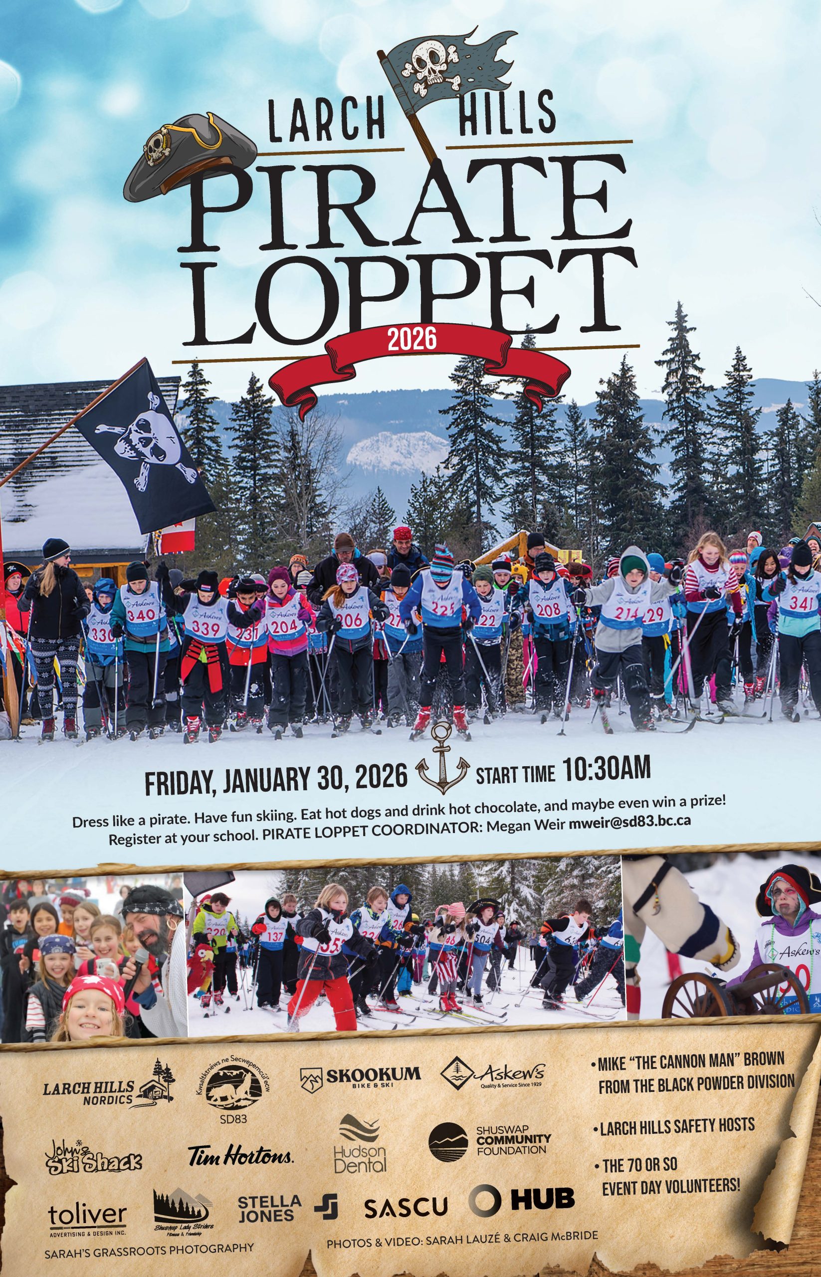 An area on the east side of the Stadium will be signed for classes to gather for photos starting around 11:40 p.m. Please listen for your School’s name called to go to that area. Photos will be distributed digitally to Teachers through the SD83 Office after the Pirate Loppet.